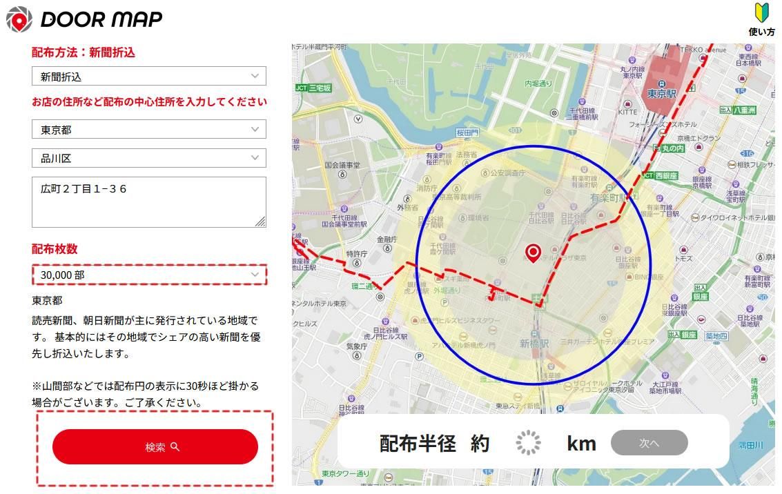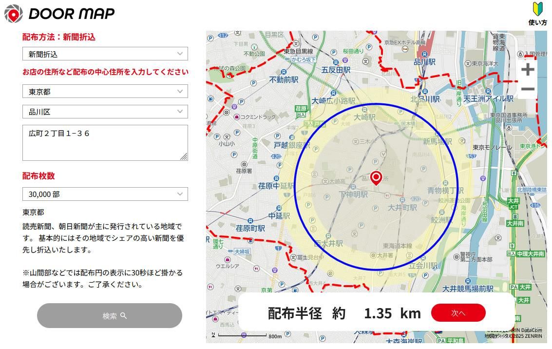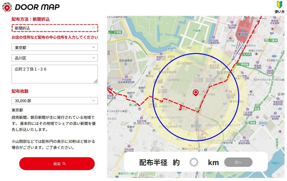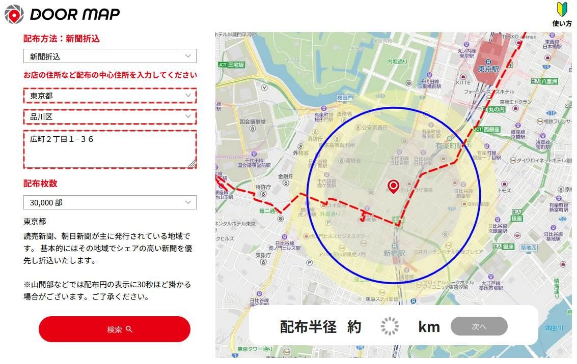 インターネット上で配布範囲を地図から指定し、それに沿って新聞折込やポスティングを組み合わせてチラシ配布を行うサービスです。