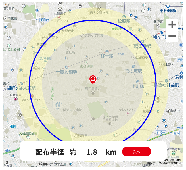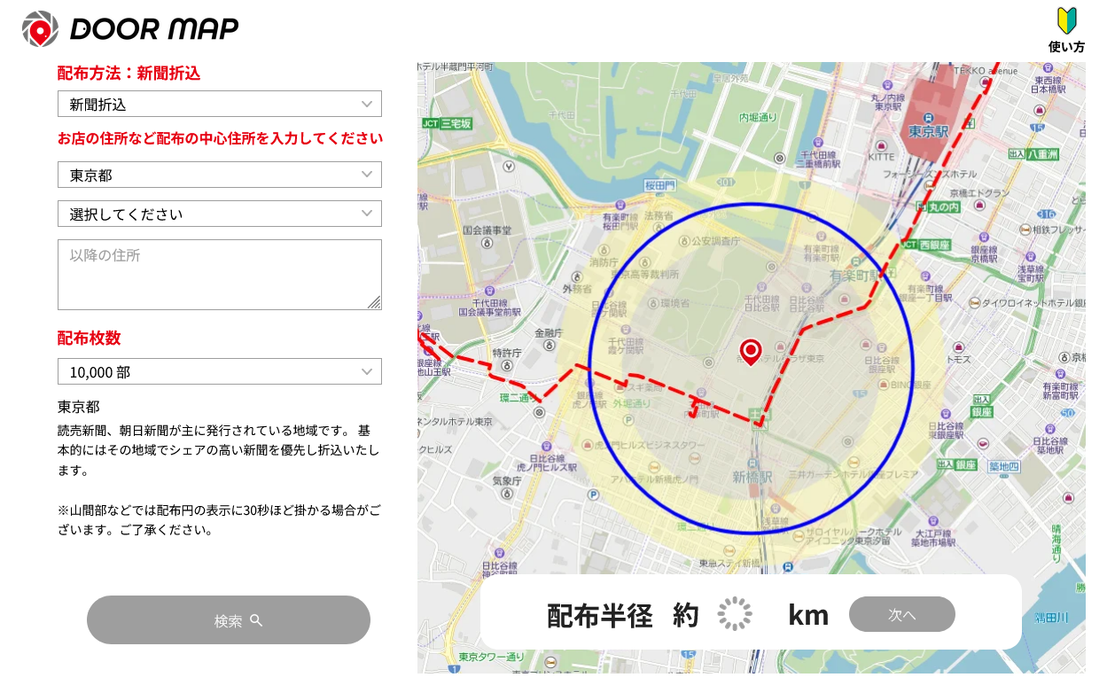 チラシ配布を行いたい店舗・企業。自分のお店・施設の住所を中心に、どのあたりに何枚配るかを制御したい広告主