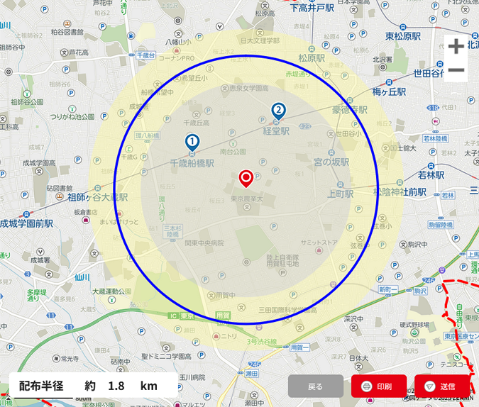円の内側で特に配布を重視したい場所があれば2箇所まで重点ピンを設置できます。重点ピン設置地域周辺へは配布漏れが起きないよう特に注意して新聞店へ手配を行います。